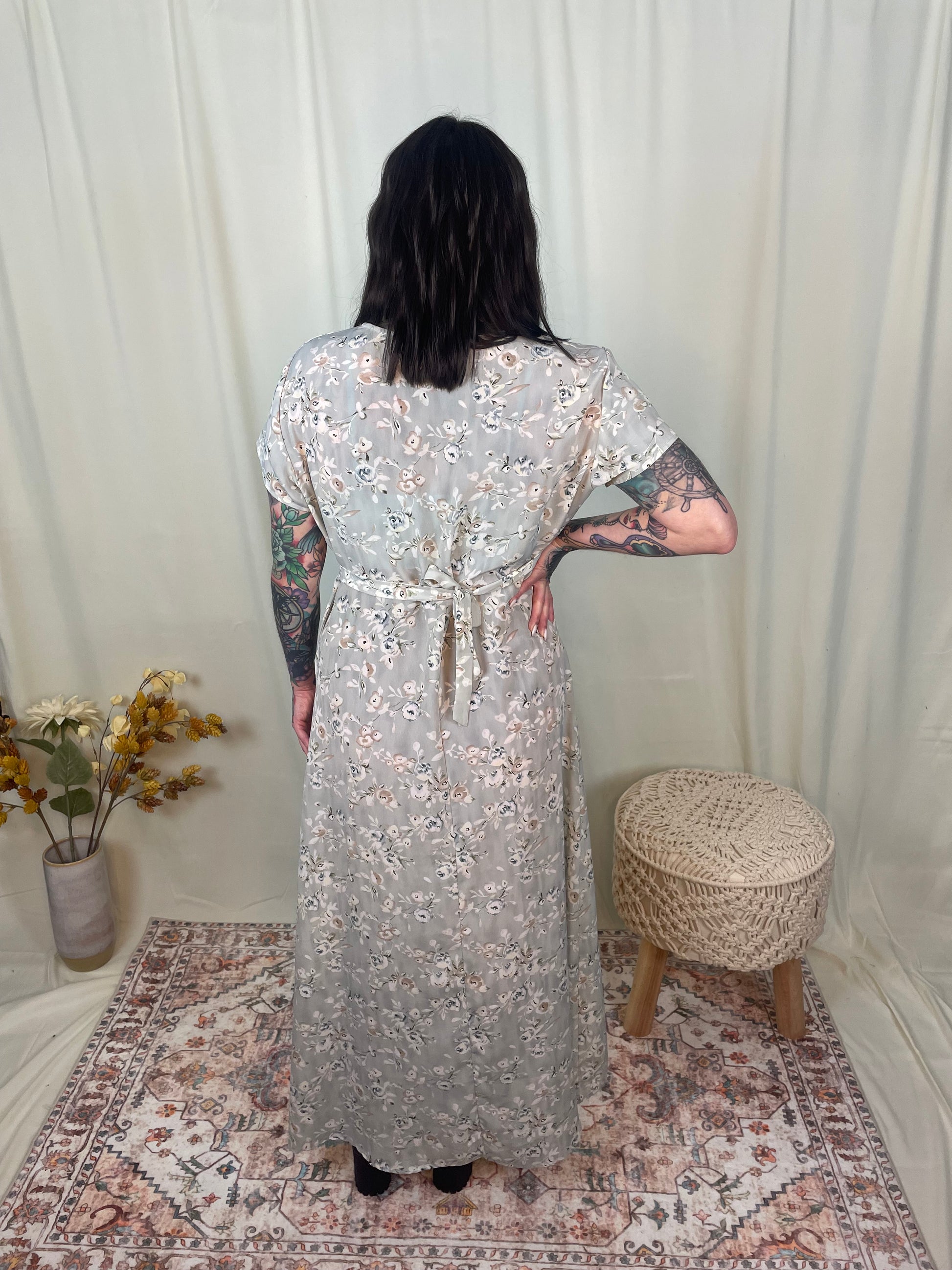 This dress is simple and sweet. The rounded neckline with the rose pattern all throughout and the lightweight fabric makes for the ideal summer dress for any occasion!