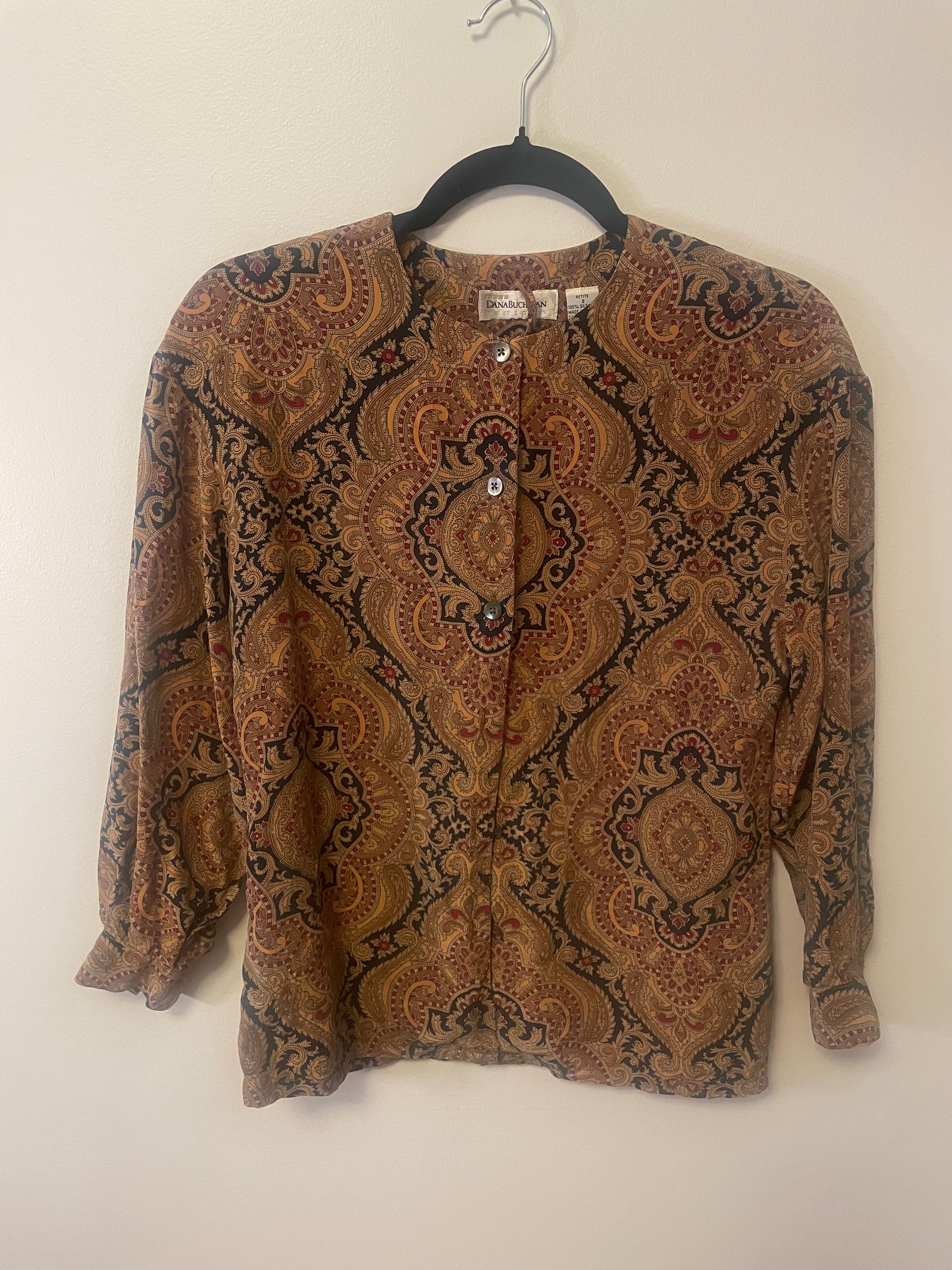 Silk, paisley patterned, button down long sleeve