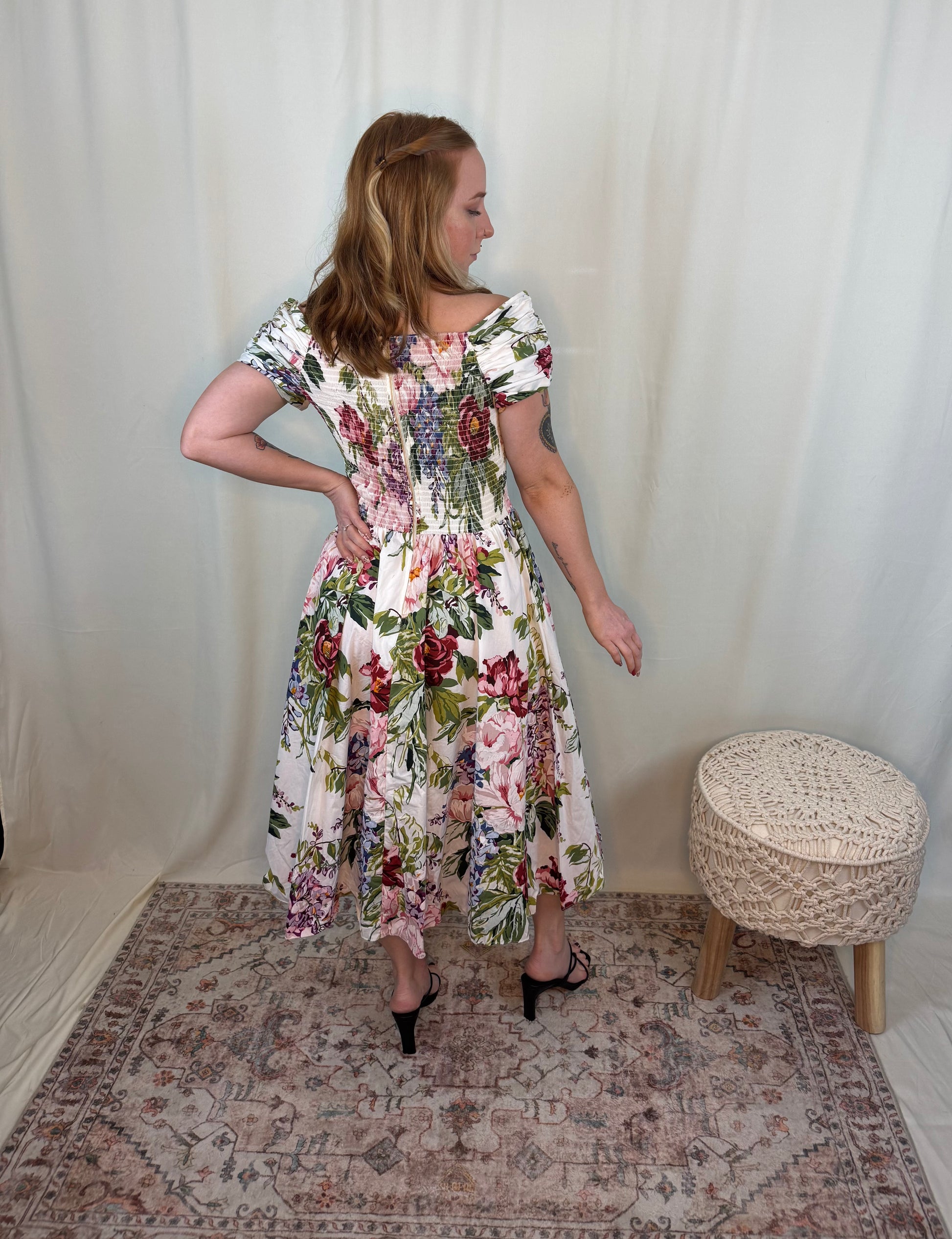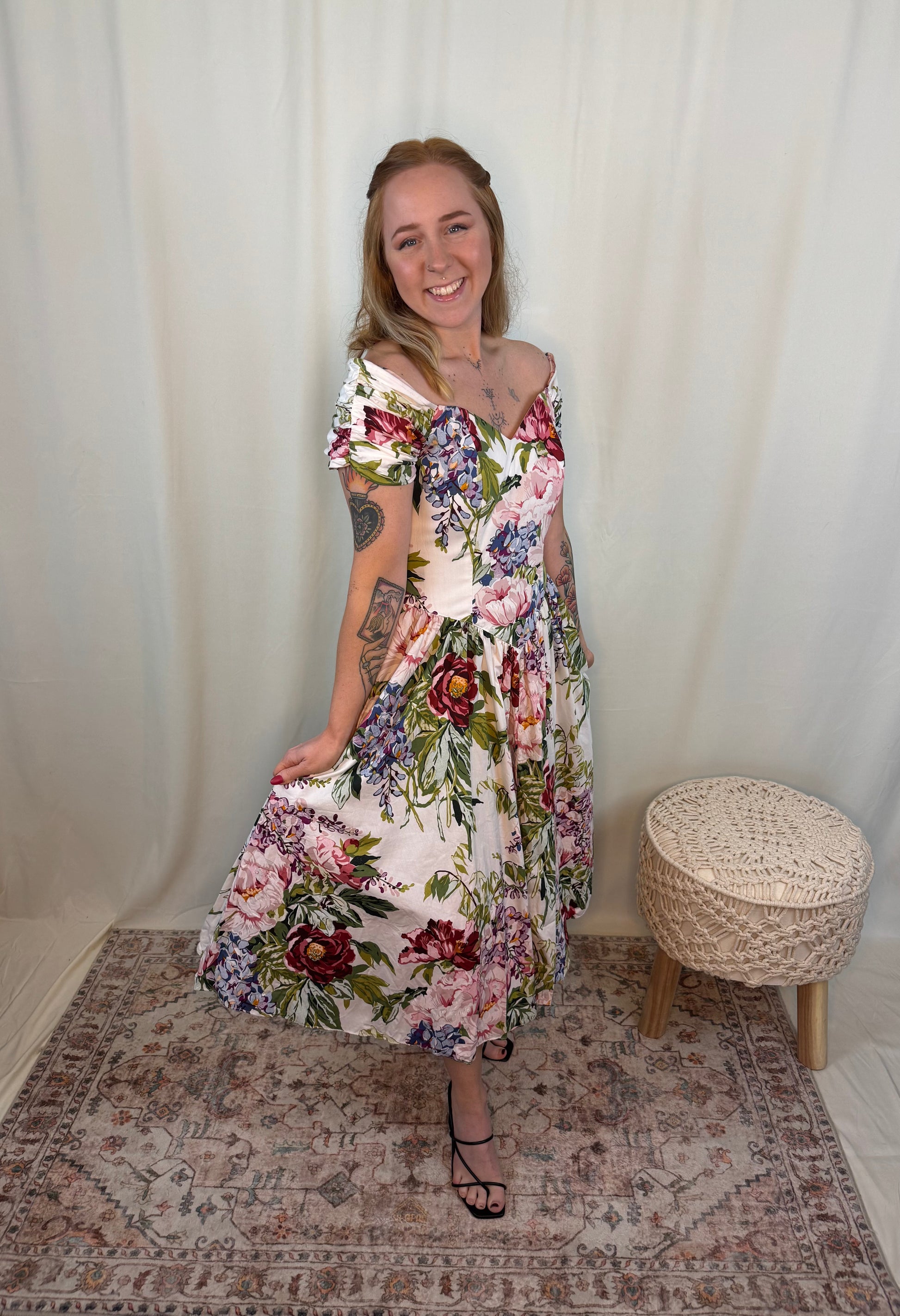 Off the shoulder soft v neckline, perfect floral spring and summer dress